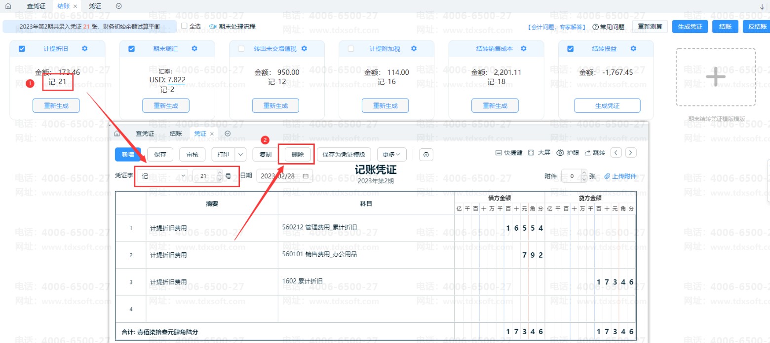 打开【结账】界面,在【计提折旧】项目,点击生成凭证的凭证号,即可打开折旧凭证编辑界面,直接点击【删除】按钮即可