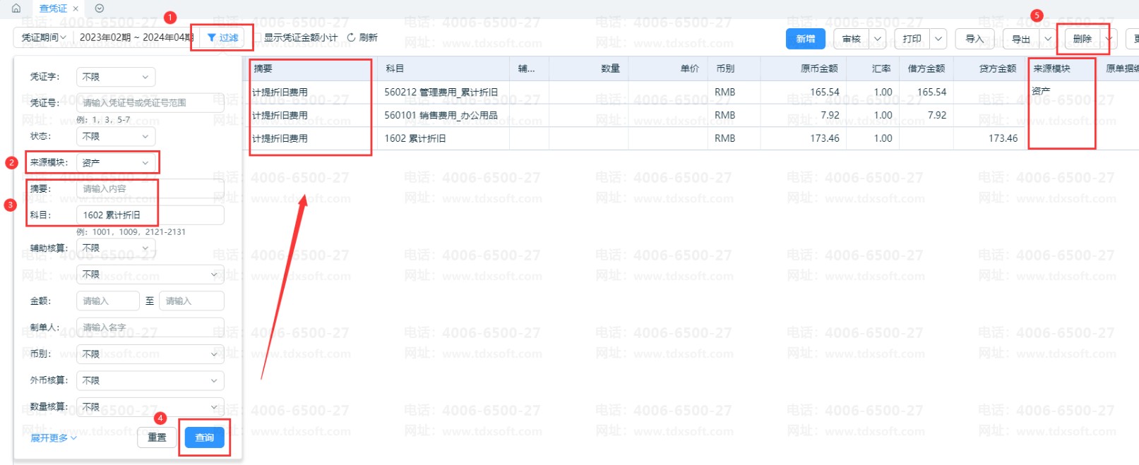 在【凭证】-【查凭证】,点击【过滤】按钮,按以下条件筛选查询折旧凭证,再【删除】