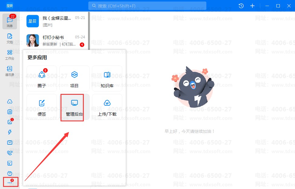管理员在钉钉PC 端点击左下角【管理后台】,登录钉钉管理后台界面: