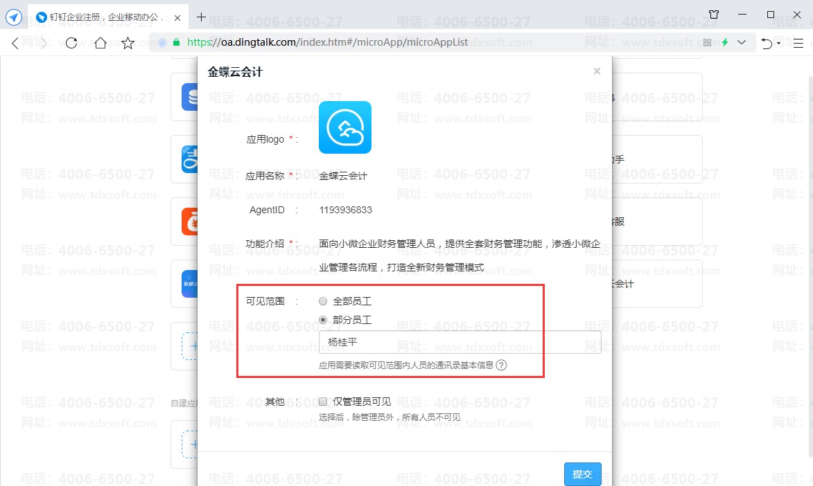 点击【工作台】找到【金蝶云会计】应用,鼠标选中金蝶云会计应用程序,再点击【设置】按钮,在可见范围中可选择“全部员工”或“部分员工”授权,设置完成后点击【提交】即可完成授权。