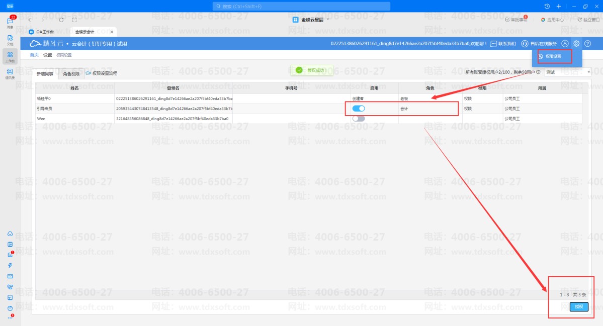 管理员创建好账套后点击右上角【设置】-【权限设置】,打开权限设置界面可看到在启用钉钉中已授权的子账号信息,右上角选择需要授权的账套(不同账套需要单独授权),选择好账套后将需要授权的子账号点击【启用】按钮,然后选择具体的角色,如选择【会计】角色,设置完成再点击右下角的【授权】按钮完成所选账套的授权。