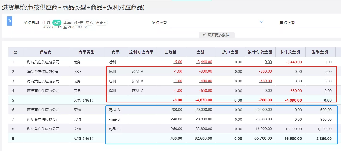 业务难点:不仅要直接展示本单的返利,还需要按某种商品的返利分别列示,体现每种商品返利与货款分开的已付和未付的详细数据