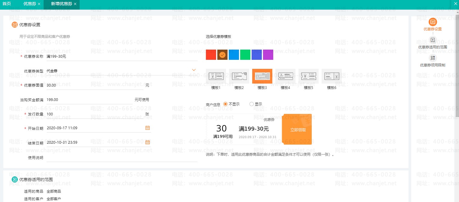 2:比如店内优惠券,可以设置好优惠券的名称(满199-30元),面值、发行数量、开始结束日期、适用范围和领用限制,设置以后可以进行发布,客户可以通过旺铺首页进行领取相关优惠券;