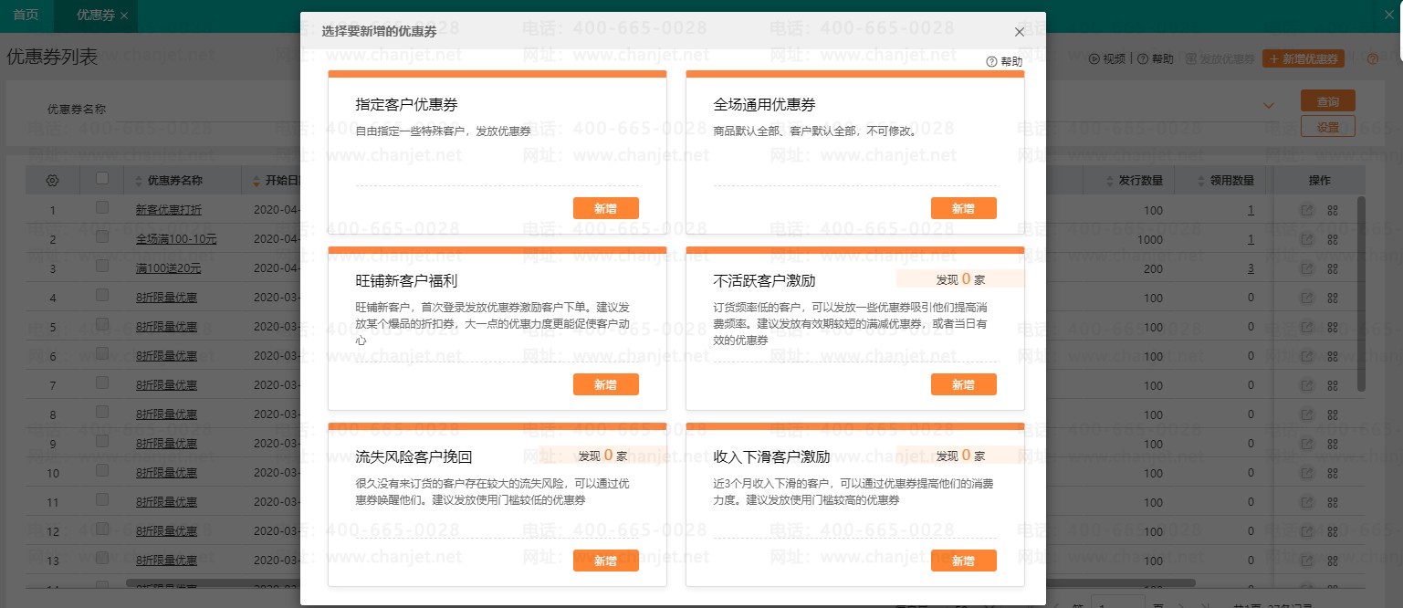 1:每逢节假日或店庆店铺做活动时,可以用店铺满减优惠券来吸引顾客进店下单,可以通过好生意促销的优惠券来实现,好生意支持新增六种不同类型的优惠券,商家可以根据需求进行选择;