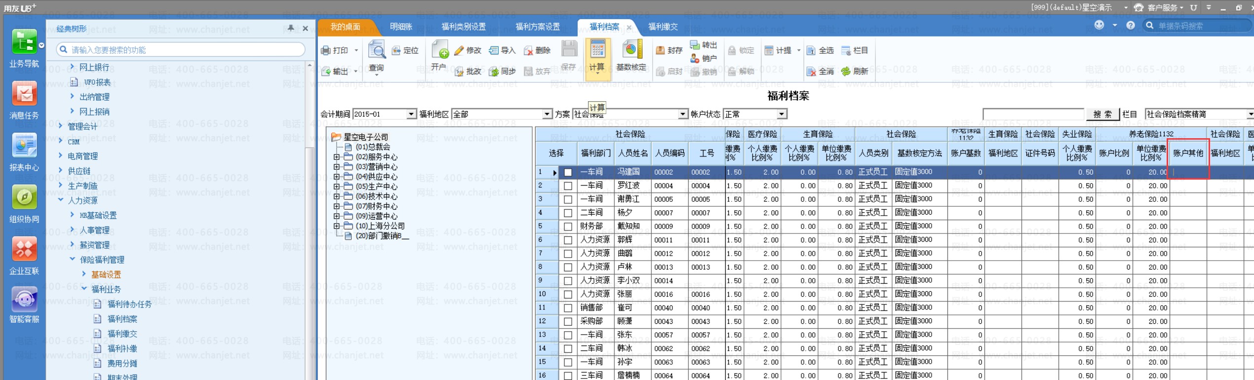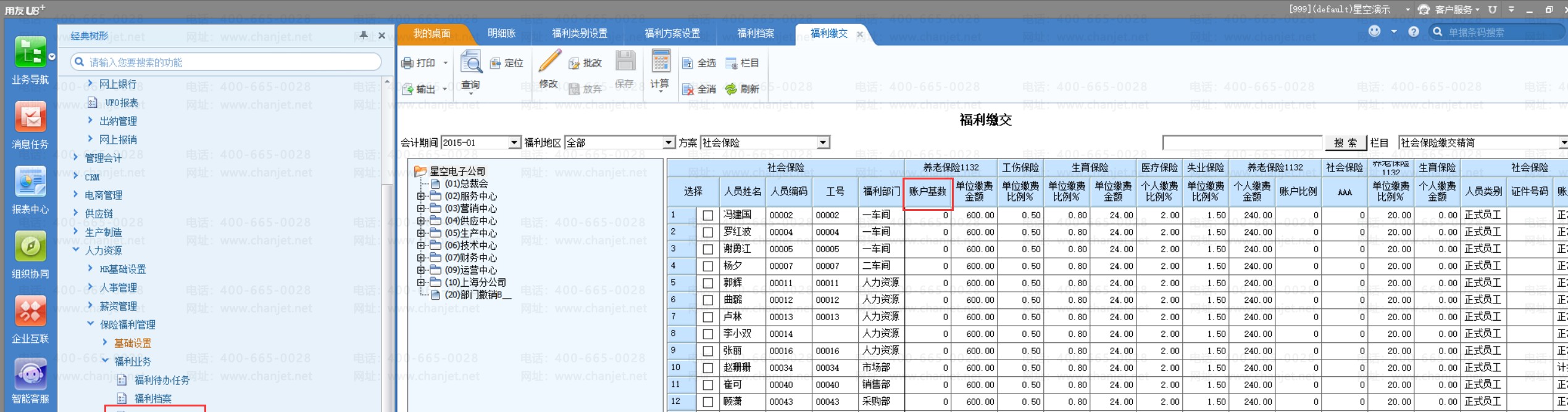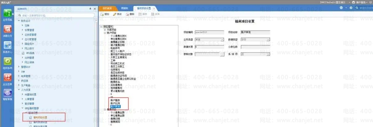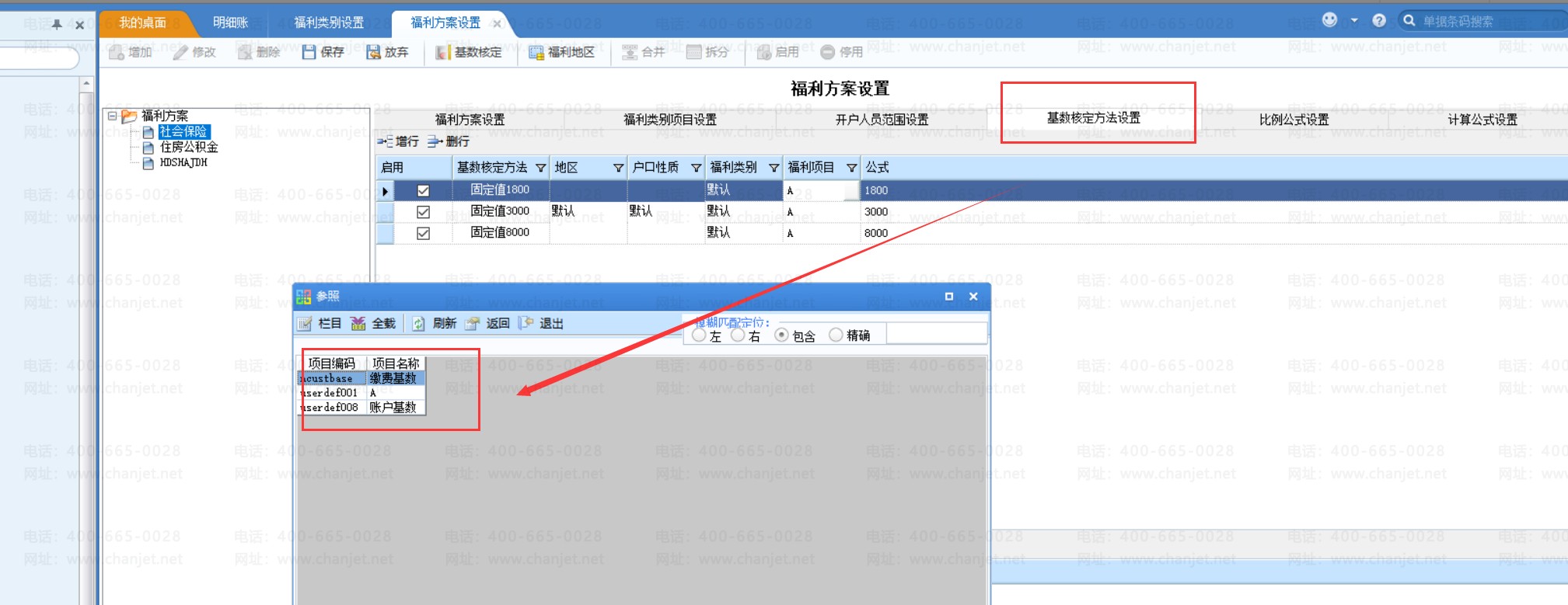 3、 其中,账户项目 【账户基数】体现在福利方案设置的基数核定方法设置页签内的福利项目以及福利档案、福利缴交中