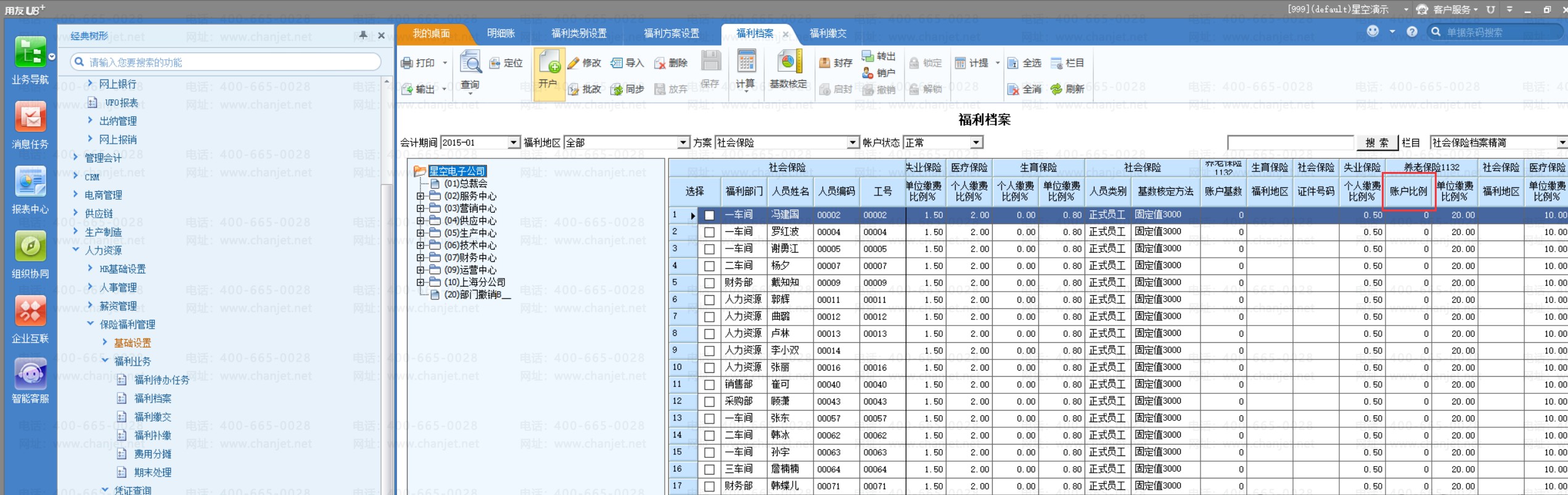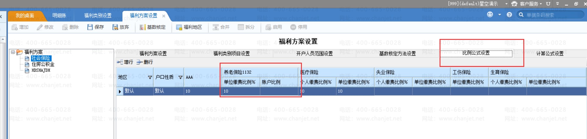 4、其中,账户项目 【账户比例】体现在福利方案设置的比例公式设置页签内的保险业务列、福利档案、福利缴交内