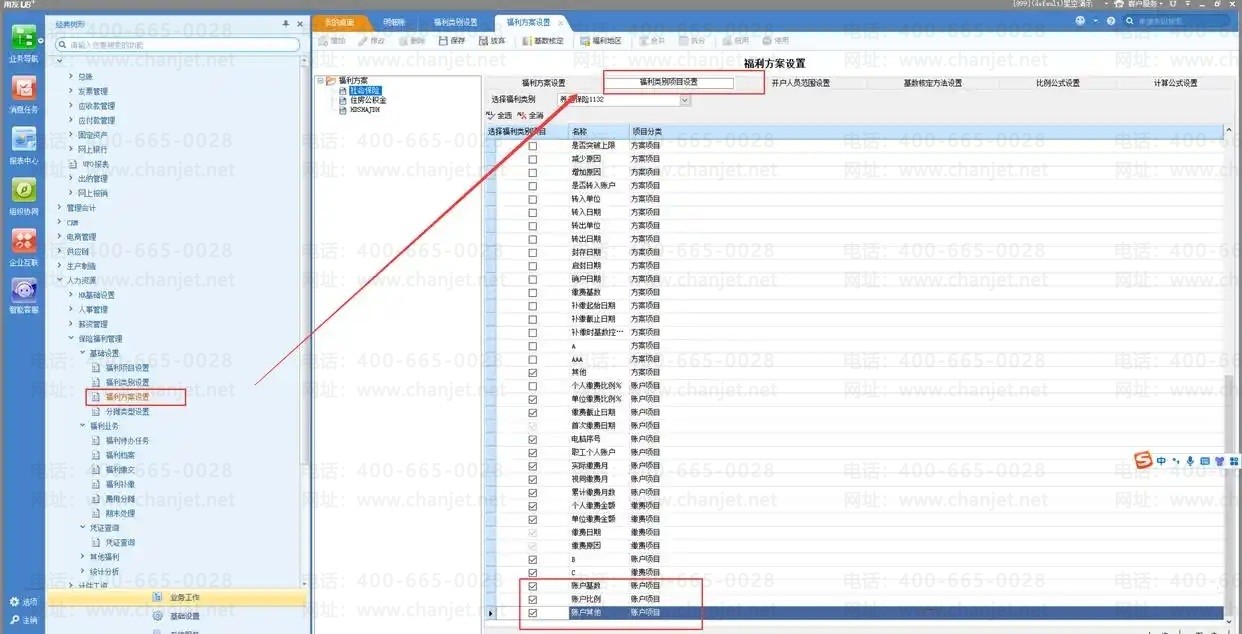 2、在保险福利管理-基础设置-福利方案设置,福利类别设置页签勾选增加的账户项目