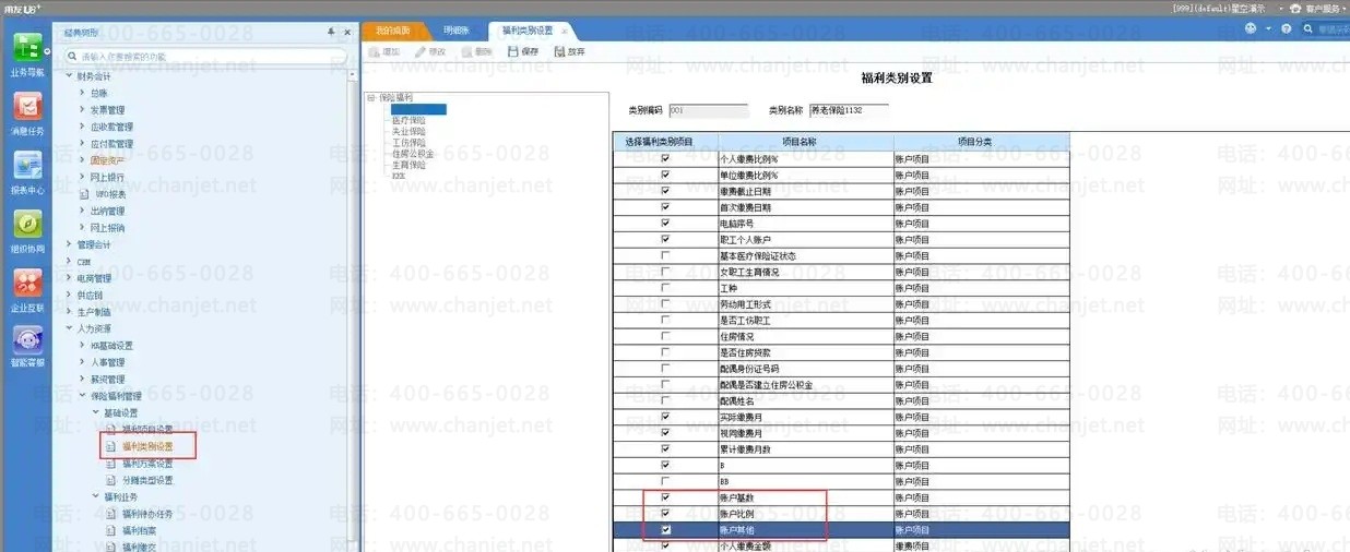 1、 在福利类别设置中,将增加的账户项目勾选上
