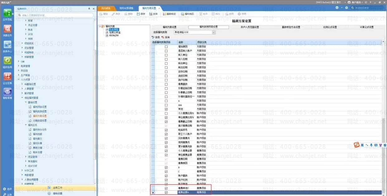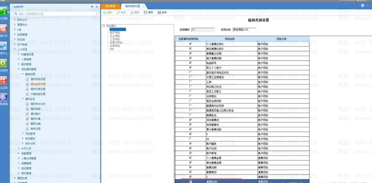 2、在保险福利管理-基础设置-福利方案设置,福利类别设置页签勾选增加的缴费项目