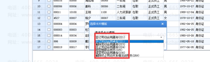 2、人事合同管理-劳动合同打开,选择合同模式,勾选要输出合同的人员后,输出下列菜单选择卡片模板,找到合同说明书确定并输出即可。