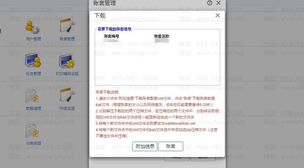1.请依次点击“附加信息”下载账套配套xml文件,点击“账套”下载账套数据bak文
