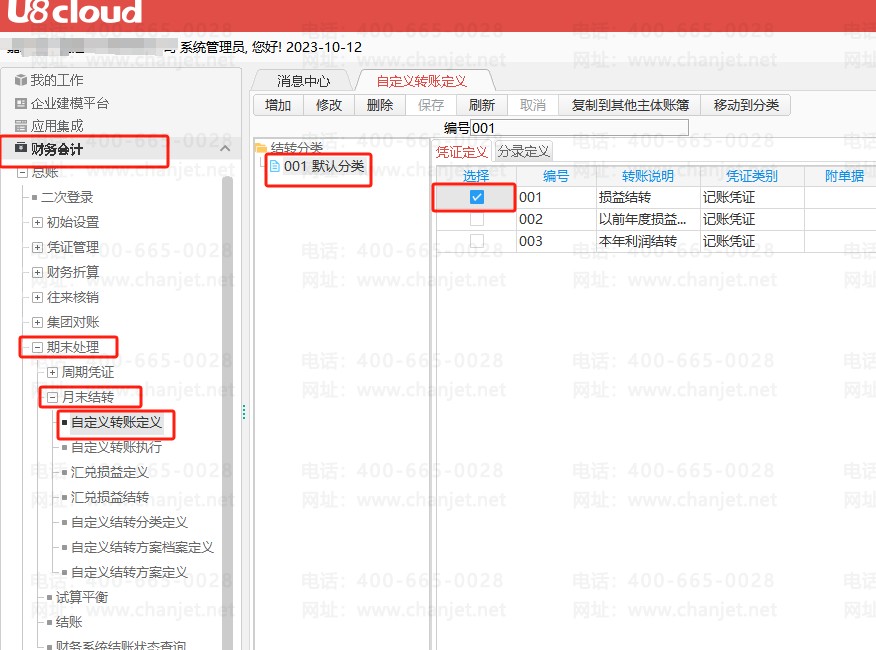 1、进入软件,打开模块 财务会计—期末处理—月末结转—自定义转账定义—选中默认分类—勾选损益结转。