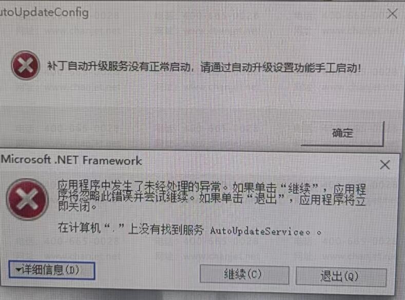 应用程序中发生了未经处理的异常。如果单击“继续”,应用程序将忽略此错误并尝试继续,如果单击“退出”,应用程序将立即关闭。在计算机“”上没有找到服务AutoUpdateService。。