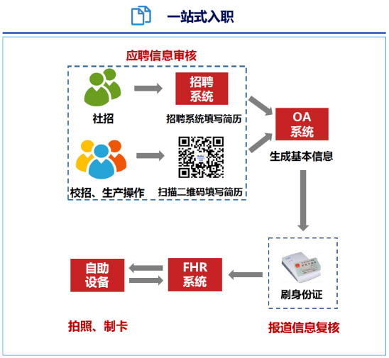 在烽火通信的人力共享服务中心,新员工入职时无须再线下填表,而是通过扫描二维码进行在线填写档案信息,HR人员对信息核实完成后,通过人事共享自助服务机现场为新员工制作集考勤、门禁、饭堂等功能于一体的工卡,员工领取工卡后当天即可使用。在之前,新员工工卡制作至少需要2-3天时间。