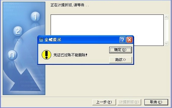 用户在使用金蝶KIS专业版计提折旧时,系统提示:凭证已过账不能删除,点击确定按钮后,返回到软件界面,无法完成计提折旧的操作。