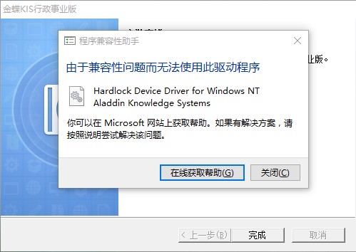 1、客户端安装最后一步智能卡驱动报兼容性问题,请点关闭按钮;如果使用的是智能卡加密请到金蝶注册网站(reg.kingdee.com)左下角下载“智能卡最新驱动程序”安装最新驱动;如果使用的是硬盘许可,可以不安装最新驱动。
