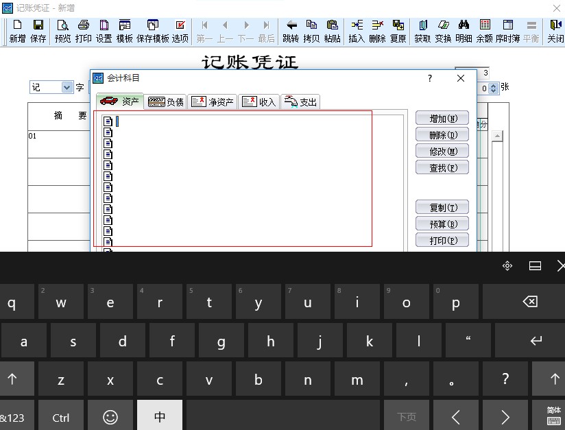 4、使用触摸键盘时,会计科目会显示空白,此问题暂时只能停用触摸屏: