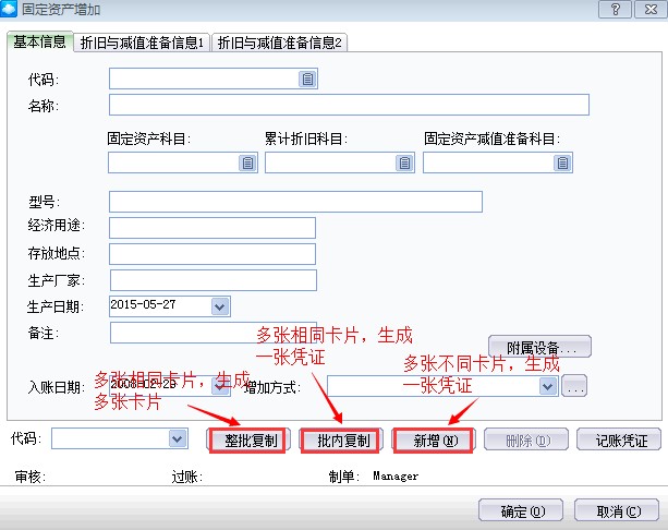 新增多张固定资产卡片进行管理合并为一张固定资产卡片,通过备注标注