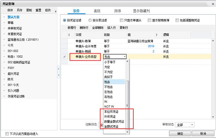 V7.3版本通过对凭证的“业务类型”字段增加特定的比较符来实现轻松地过滤出本位币凭证及金额式凭证。操作界面详见下图: