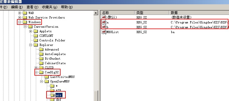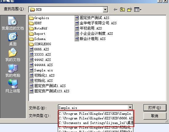 账套打开信息保存在注册表HKEY_USER/Software/Microsoft/Windows/ ComDlg32/OpenSaveMRU,在OpenSaveMRU\AIS下,就是最近打开过的AIS的文件列表,把除MRUList和默认以外的值删除