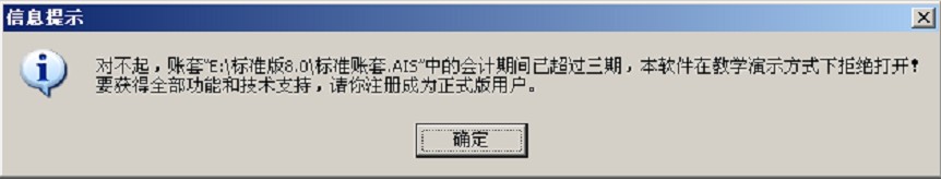 在登录金蝶KIS标准版软件后,系统以演示版方式运行,最可能的原因之一是系统未能检测到加密License文件或者加密卡硬件信息,此时如果打开的账套未过三期系统仍可以在演示版的状态下将其打开如图1-04所示,如果打开的账套已使用超过三期,则在打开账套时系统直接提示如图 1-05所示: