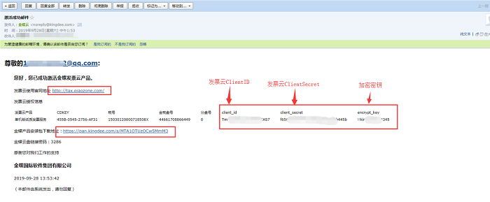 购买并激活发票云的收票服务之后,激活成功的邮件中会包含client_id、client_secret以及加密密钥三项信息,这三项信息将用于金蝶云星空的收票配置