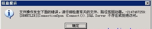 财务结账、启用账套、备份账套时提示“文件操作发生下面的错误,请仔细检查有关的文件、路径和驱动器。-2147467259:[DBNETLIB][connectionopen(connect9()).]SQLserver不存在或拒绝访问。”如下图:
