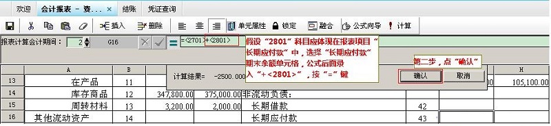 选择“长期应付款”期末余额单元格,在公式栏添加"+<2801>",再按“=”键,点击“确认”后保存公式