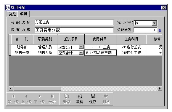 3. 工资费用的分配. 可根据不同的职员类别把职员的工资计入到不同的费用科目中, 并让系统根据设定的分配方案产生一张工资费用分配的凭证. 如下图: