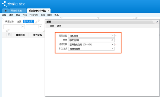 2. 新增后台引出任务(任务类型:列表引出、单据:需要引出的账表)