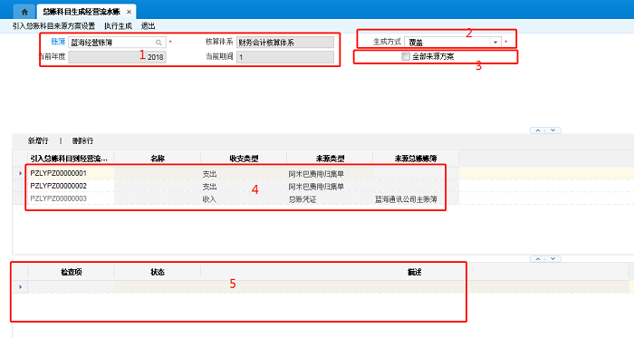 勾选:将清空引入总账科目方案设置对应的单据体数据。表示该经营账簿下所有的引入总账科目方案设置 (已审核,分录勾选准许引入)生成经营流水账。