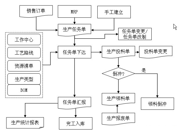企业的生产任务管理通常是由生产部门门运行MRP产生并向向生产车间下达生产计划,生产车间按照生产部门的生产计划安排车间生产。在生产任务管理过程中需要处理各种来源的生产任务,及时了解物料和能力的可用情况,进行排产;并及时掌握生产进度,管理生产过程的物料流动,控制生产过程中的各种变化,按时按量生产合格的产品。