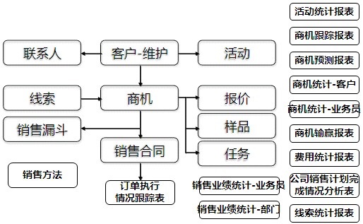 根据商机项目管理,系统提供了多个分析报表,包括商机跟踪、商机预测、商机赢单、商机输单、业务员和部门的商机统计、销售漏斗、销售订单执行分析、活动统计、费用统计、客户产品清单、业务员和部门的销售业绩统计、竞争对手分析、线索统计、线索转化分析、公司销售计划完成情况17张报表。