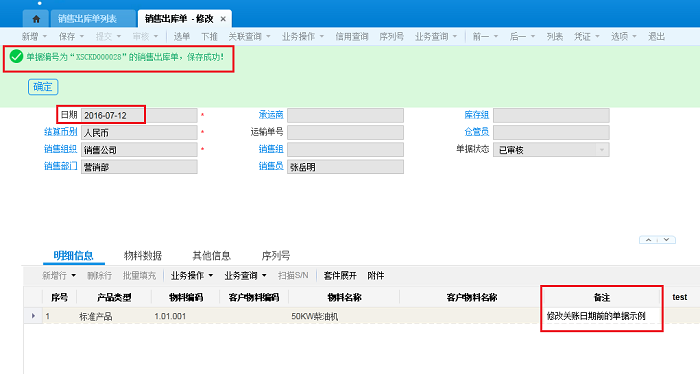 现在修改表体的备注信息并保存: