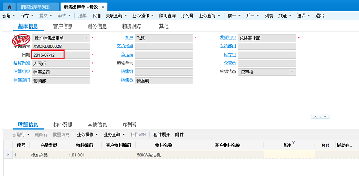 销售出库单的业务日期为2016-7-12,此时表体的备注为空: