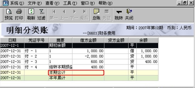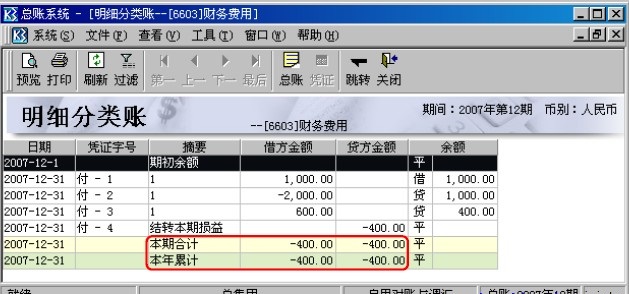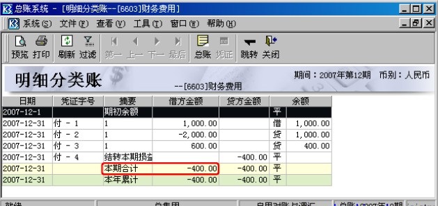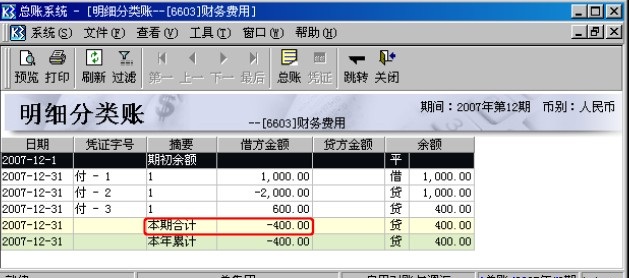由于JL等于当年JF的合计,DL等于当年DF的合计,SL等于当年SY的合计,所以本案例重点关注JF、DF和SY的区别。费用类科目常用JF和SY,收入类科目常用DF和SY,本案例以费用类科目为例,因此着重将JF和SY的取数进行对比,收入类科目与之类似,不再赘述。 为了看出冲减凭证和结转损益凭证对JF和SY取数的影响,本案例选取的科目在当期发生了冲减业务且余额为负数,案例数据如下: 某公司2007年12月发生以下几笔与财务费用有关的业务: