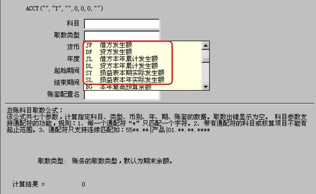 设置ACCT函数公式时,在【取数类型】处按F7,可以调出所有的取数类型,系统标示了各个取数类型的含义,利润表常用取数类型的含义如图-1所示: