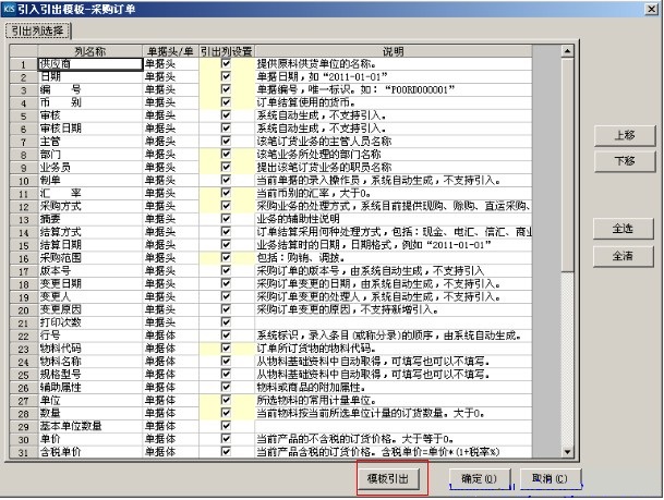 1、打开单据序时簿界面,点击菜单栏【文件】下的【引入引出模板设置】,设置引入引出模板。单据必录字段为黄色字体,不能取消勾选。设置好字段后点模板引出即可。