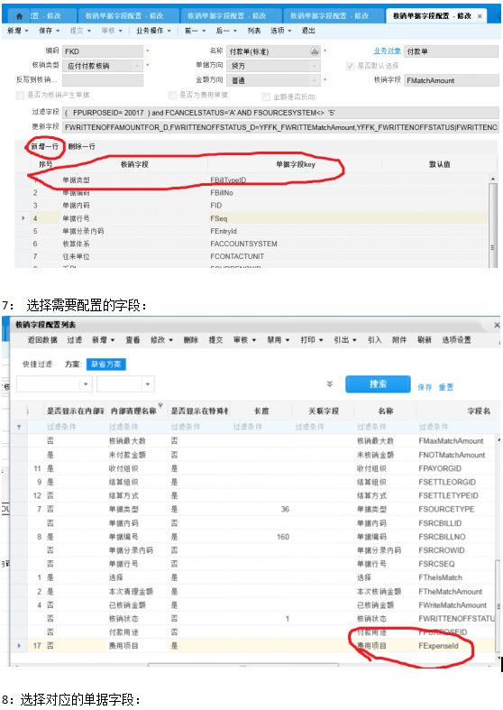 6:针对对应的核销类型,进行字段的配置,比如,上面的例子,在付款单和应付单上,进行 费用项目 字段的配置,新增一行,进行需要的字段配置:
