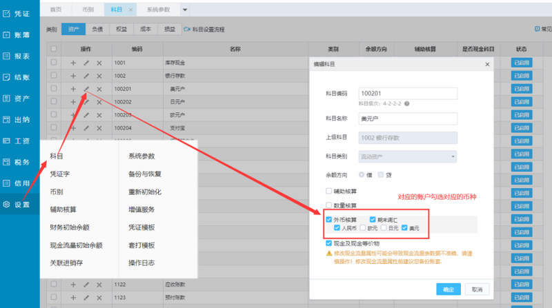 再【设置】-【科目】涉及外币的科目进行勾选外币核算,期末调汇: