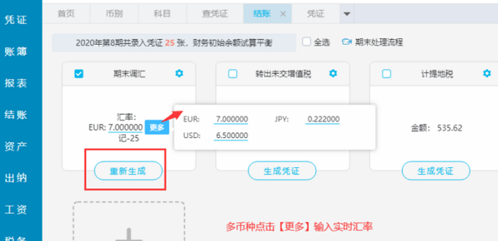 月末终了,进行结账,在结账页面,输入调汇汇率,系统自动生成调汇凭证,点击生成的凭证号即可查看凭证详情: