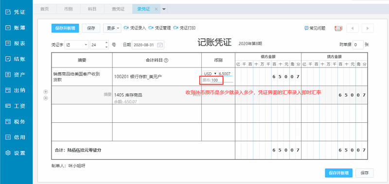 【凭证】--【录入凭证】选择外币科目,原币是多少录入多少,系统根据自动汇率自动换算人民币: