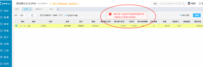 如补录之前的卡片,补录时提示:操作失败!固定资产开始使用日期早于录入期间的卡片新增不生成凭证,如下图:
