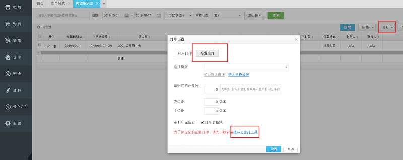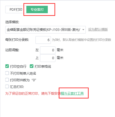 您好,打印时,在【打印设置】里面选择【专业套打】,然后在红色字体处直接下载套打工具即可。