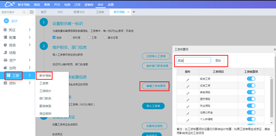 从系统下载的工资模版如果觉得内容不够需的可以自行增加列,表格上增加列之后需要在系统里面也增加上对应的列字段:工资—新手导航—编辑工资核算项。
