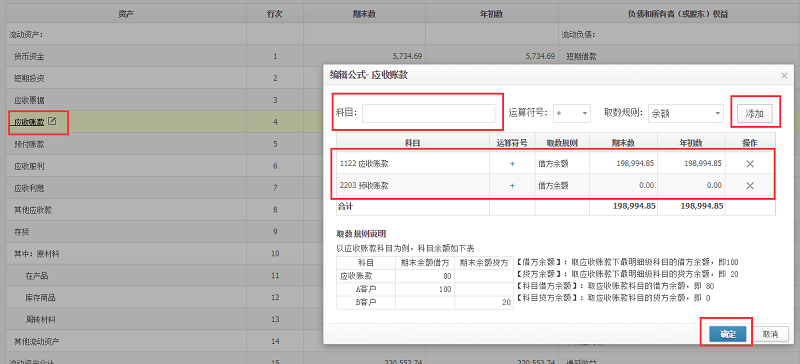 1、【资产负债表】,点击【应收账款】,将预设的公式删除,然后设置“应收账款借方余额+预收账款借方余额 ”往来公式,其他三个科目都需要这样操作;