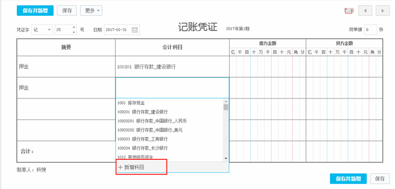 1、在会计科目下方空白出点击下 在下拉菜单中选择新增科目;