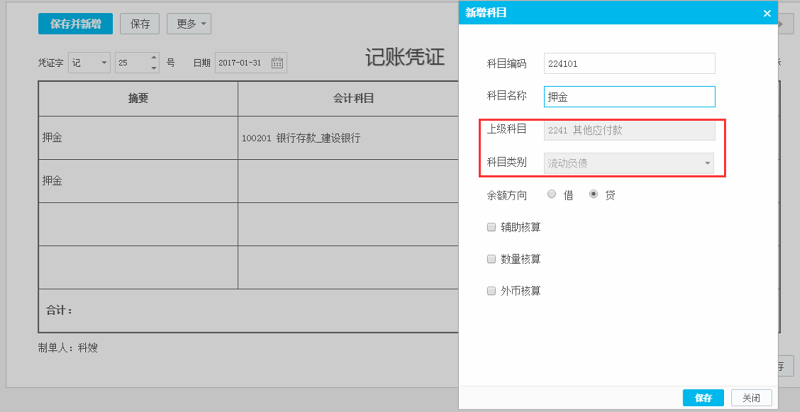 2、在新增科目界面输入科目编码224101,下面上级科目就会自动带出2241其他应付款科目,点击保存即可;