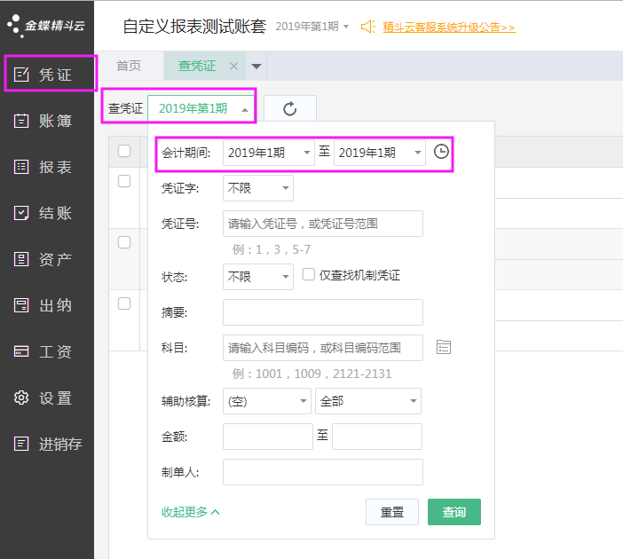 1、【凭证】-【查凭证】左上角均可以选择会计期间查看期间数据,可以在此选择相应的会计期间查看历史数据;