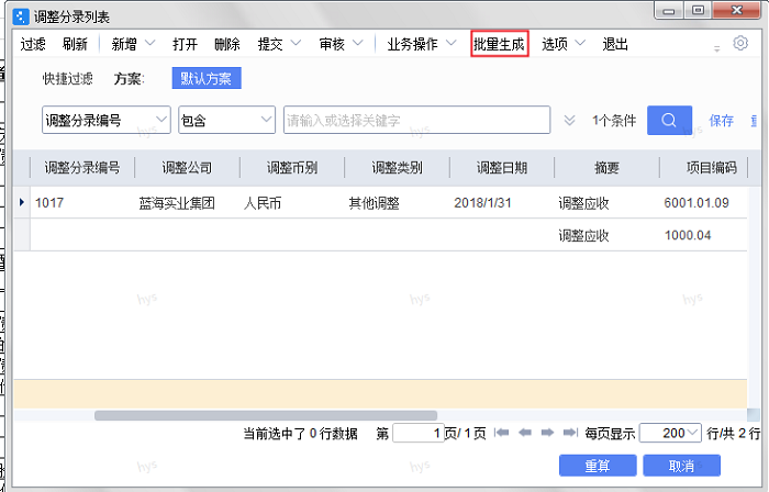 2、个别报或合并报表>合并>调整分录管理>批量生成